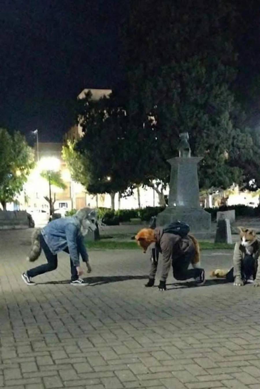 En la foto que trascendió este mediodía se observa a tres jóvenes - o no tanto- durante la noche, en posición cuadrúpeda y utilizando máscaras realistas de animales, en lo que parece ser una escena captada la plaza principal de la ciudad. La postal, por lo inusual, despertó una pregunta inevitable: ¿se trata de una broma, una intervención artística o llegaron los llamados “therian” a Cañuelas?